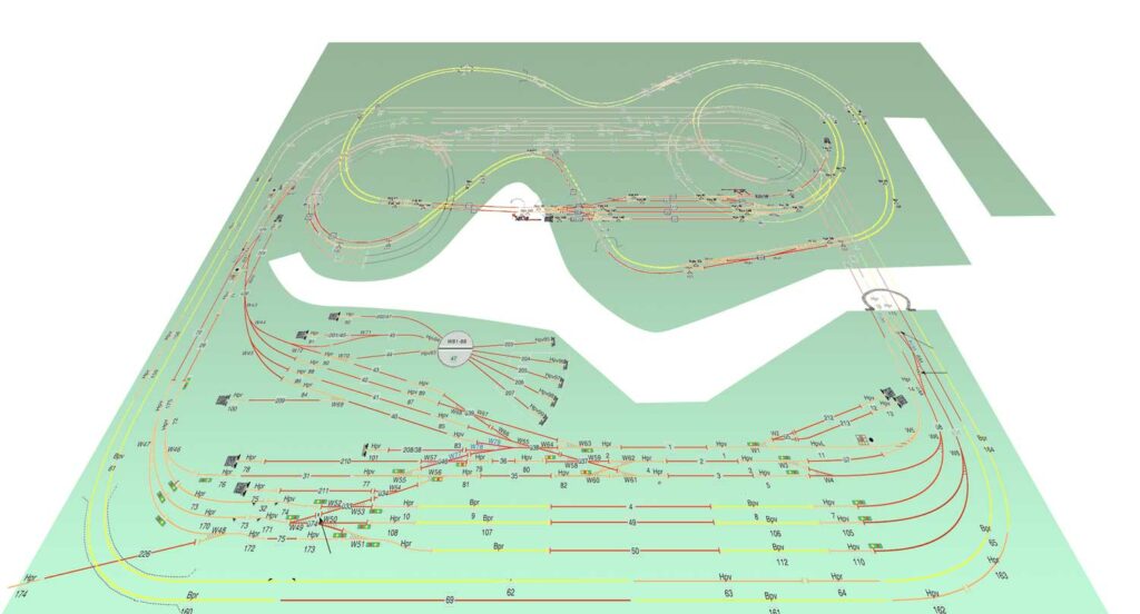 Die gesamte Anlage ist als doppelspurige Ringstrecke ausgelegt. Insgesamt sind ca. 630 m Schienen verlegt. Der minimale Radius beträgt 2m, die maximale Steigung 26 Promille. Die Blockstellensteuerung lässt einen gleichzeitigen Betrieb von 12-14 Zügen zu. Es wird im Analogbetrieb mit 2-Leiter Gleichstrom gefahren. Seit 2007 ist die neue Computerunterstützte Steuerung von Gahler + Ringstmeier in Betrieb, welche noch mehr Abwechslung im Fahrbetrieb bringt.